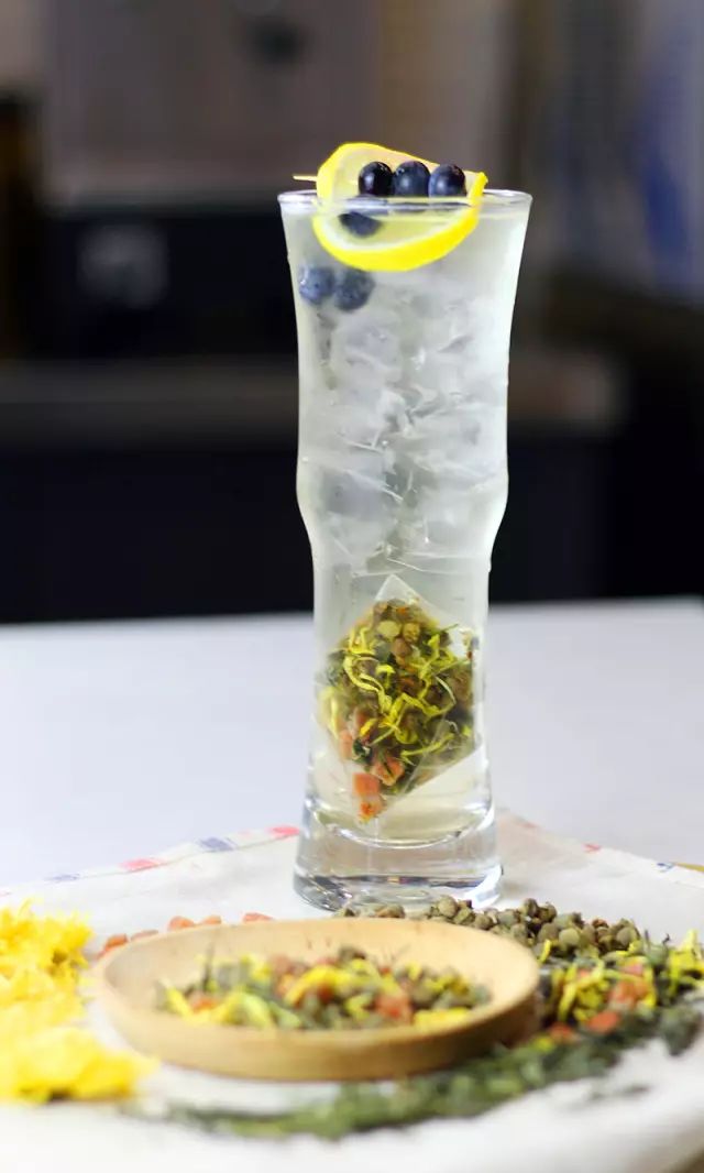 冰饮:取一包茶包加入200mL左右热水(75℃左右),使用茶夹夹30s左右,然后将雪克杯满杯冰块,加入10-15mL糖浆,最后将茶汤倒入雪克杯中雪克几下即可。